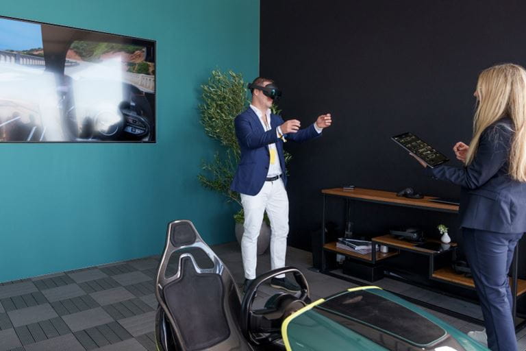 First, a guided tour from different camera angles. Then, a chance to explore and interact. Opening and closing the dramatic dihedral doors. A head-turning experience where guests can turn their heads all around. To peer in the digital rear-view mirror. Examine every feature of Valhalla’s driver-centred, driver-centric cabin. From the driver’s seat. From pole position. To experience the feeling of floating closer to the ground. Of perfect alignment. Of outrageous speed, inferred. From Valhalla’s Formula 1® inspired cockpit.