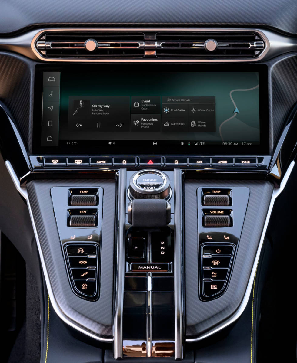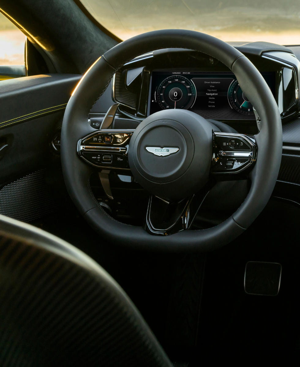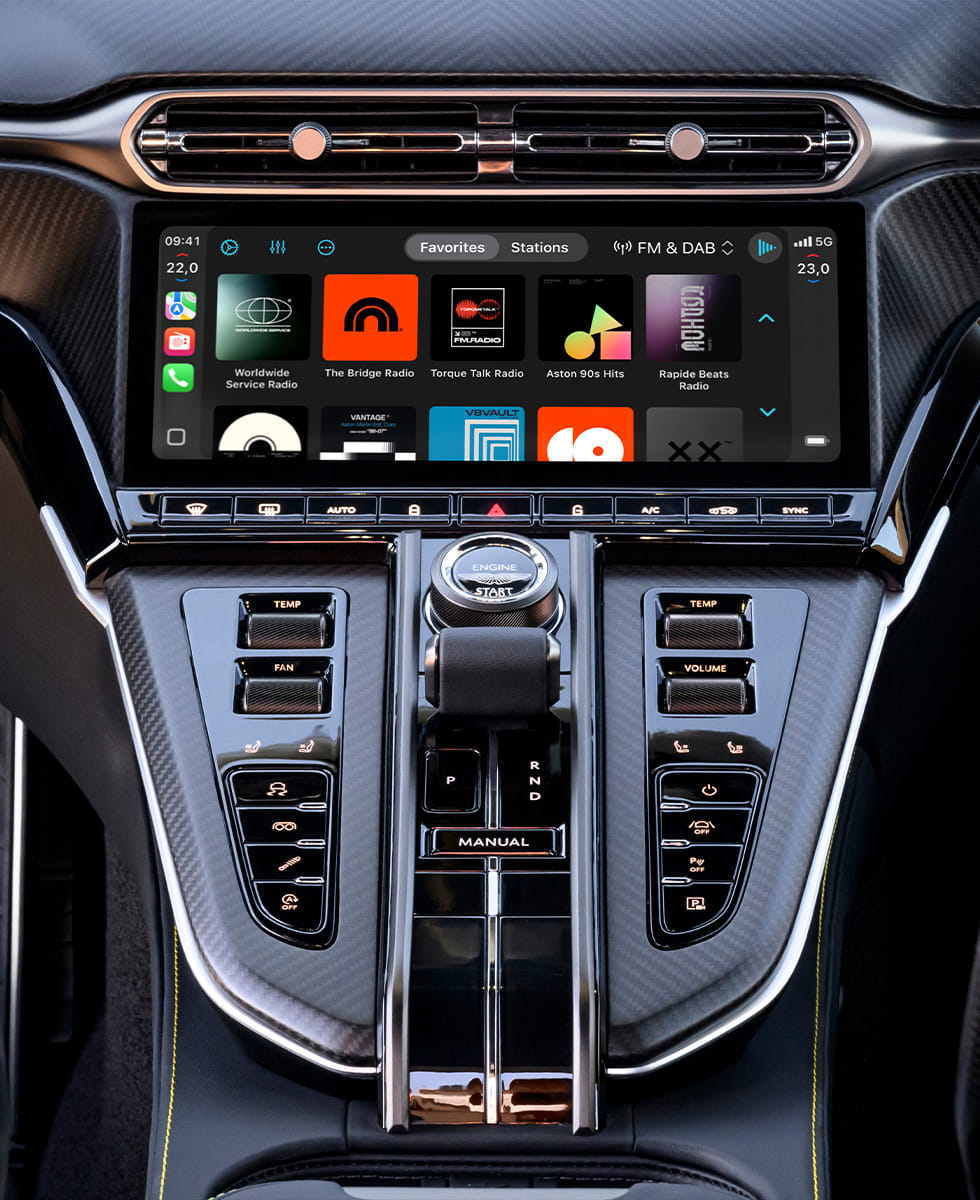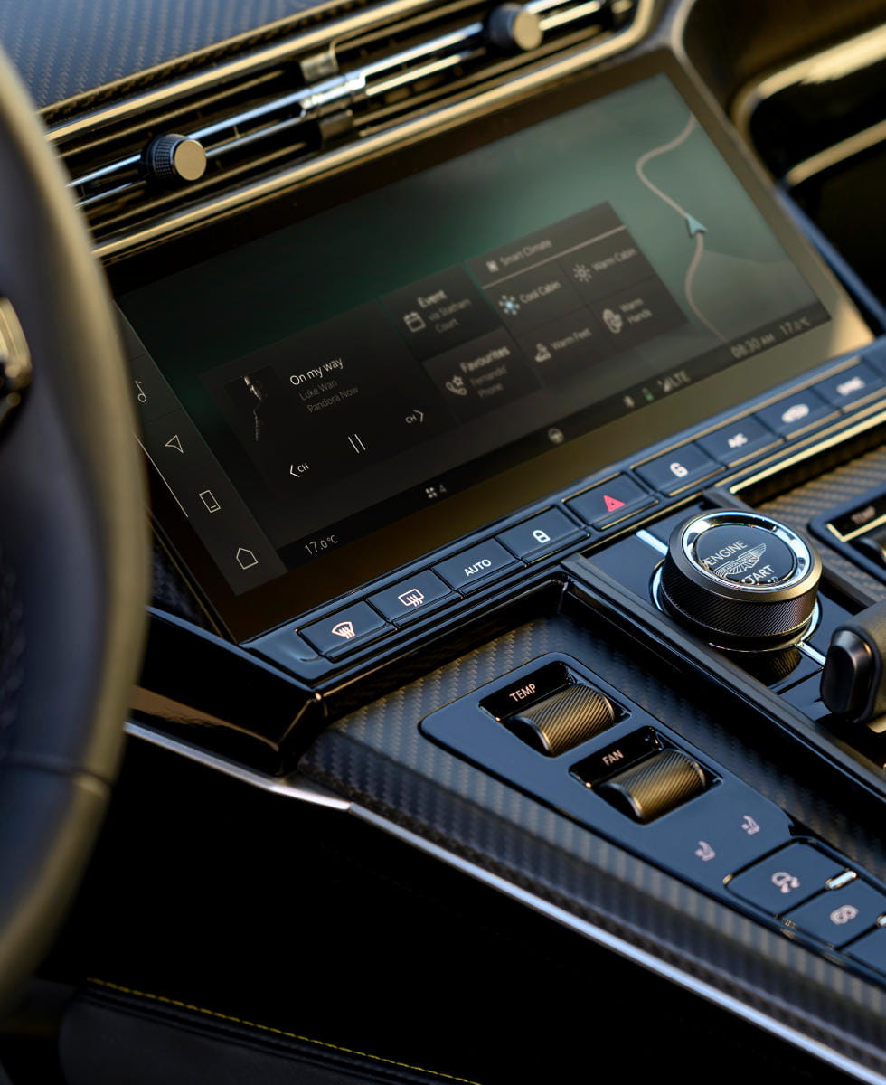 An all-new interior to match the performance of an all-new Vantage. Brushed with flawless lines, exquisite materials, state-of-the-art connected technology, and a seamless fusion of digital and analogue. Merging super modernity with an echo of heritage. Cutting-edge technology with effortless usability. Tactile mechanical switchgear combined with the latest evolution of Pure Black technology touchscreens.