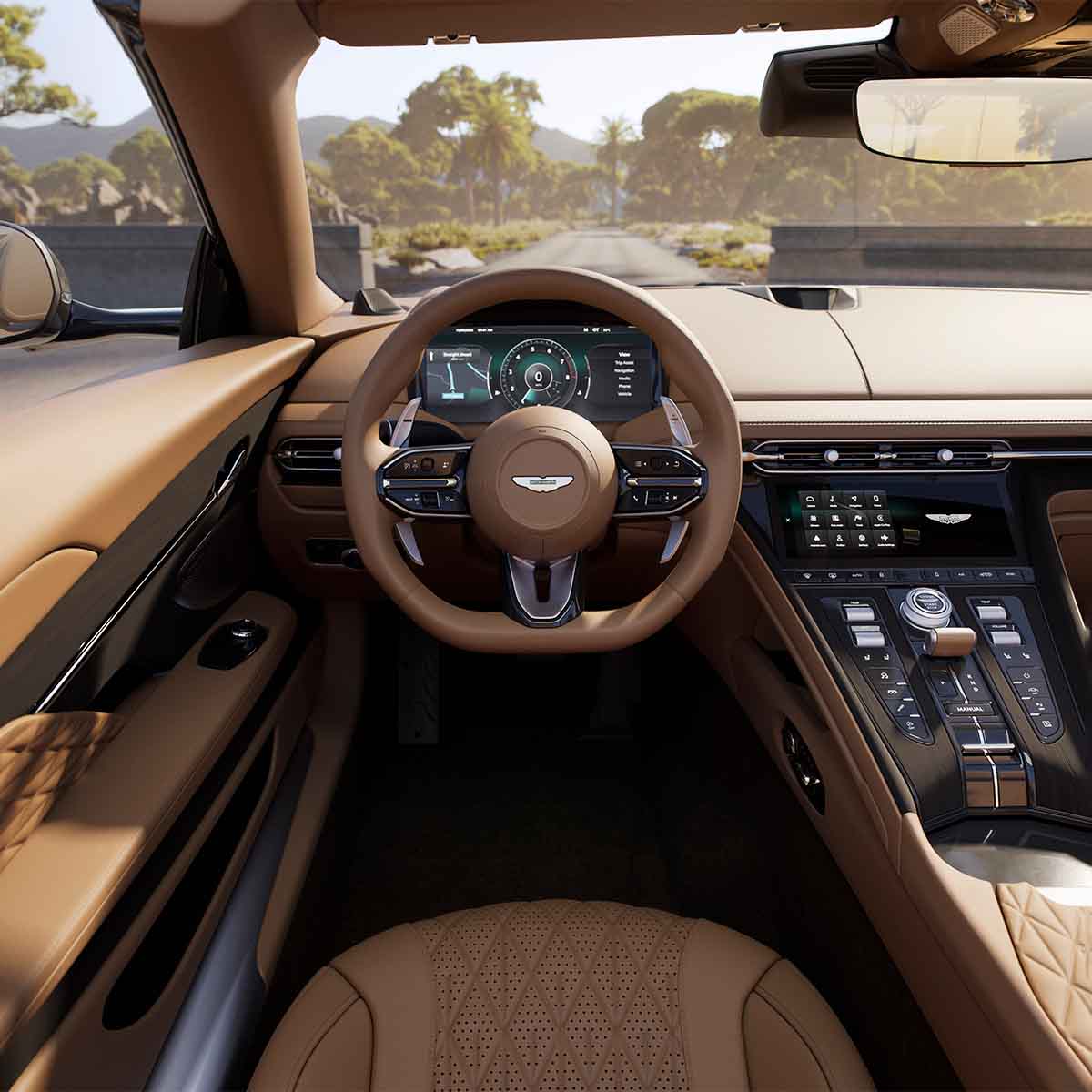 DB12 Volante is built around a new steering wheel. Lined in handstitched leather and embossed with modern driver controls for infotainment, safety and technology. Styled as the most meticulous merging of tradition and technology. And offered with a range of trim inlay options, complementing the advanced interior design. Making your super tourer as personalised, as it is unique.