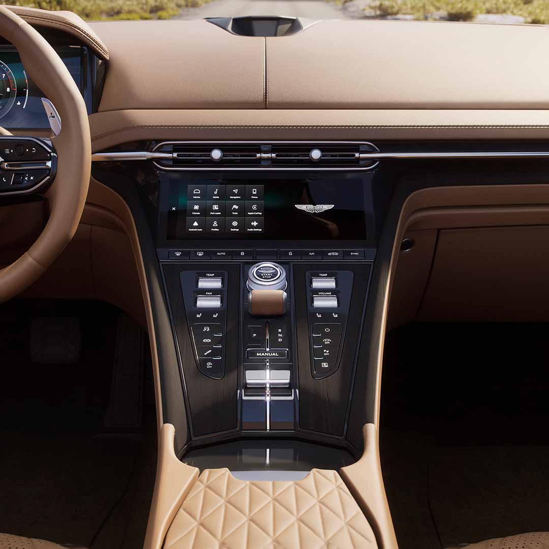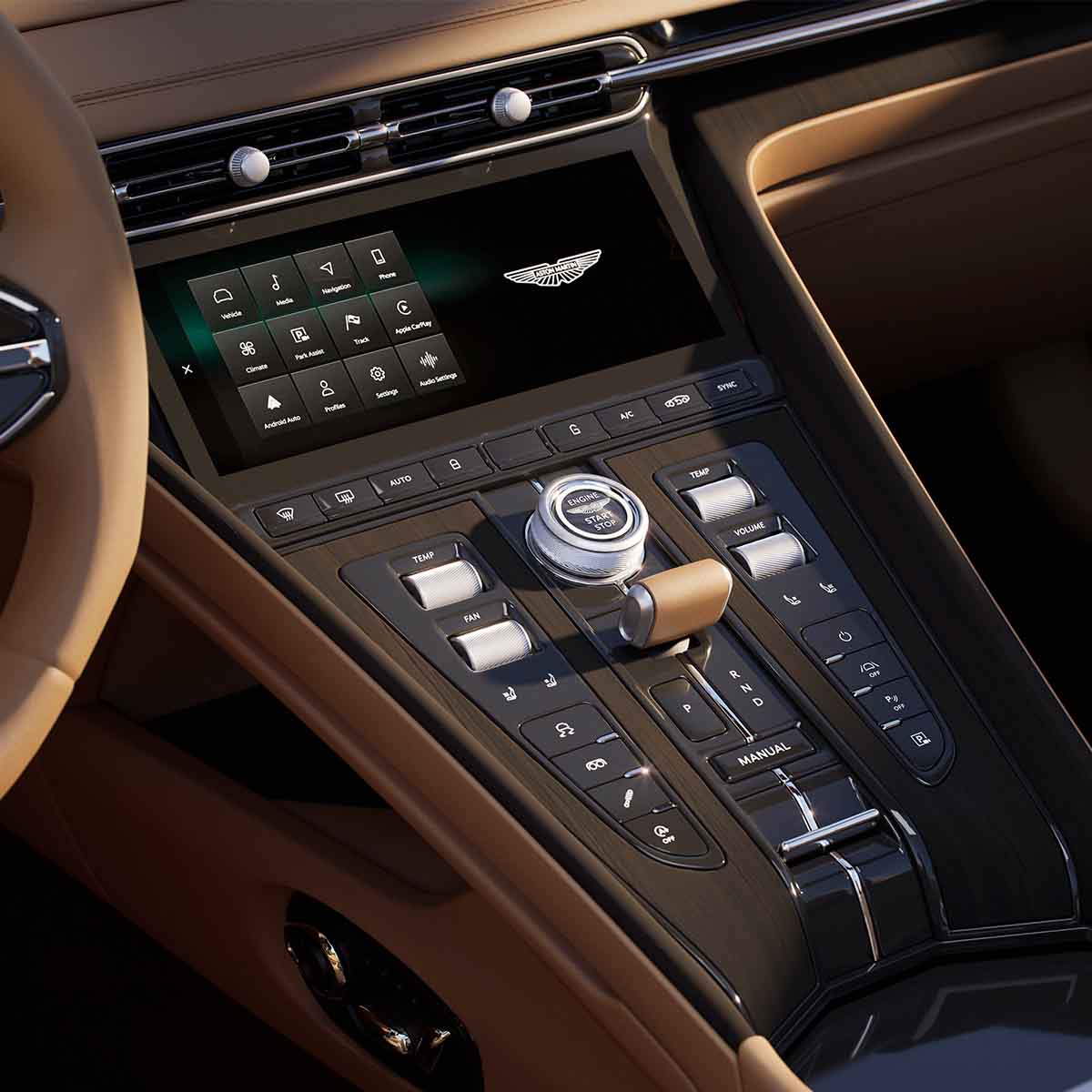 Unapologetically digital for the first time. The pupil of the car focuses with a 10.25 inch digital screen. Baring its class with newly enlightened graphics that will mark every single Aston Martin to come. Anchored by a single dial design that inputs sports focus into the highest definition touch screen in any car in the category. Taming every drop of digital enhancement to your literal touch.