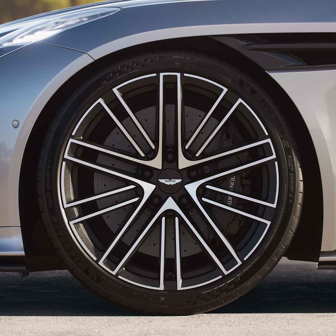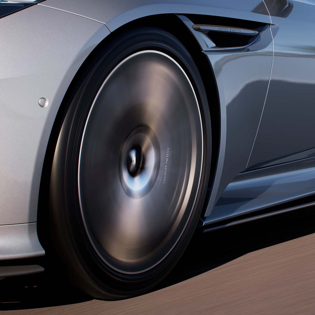A debut for an Aston Martin core GT model. The choice of carbon ceramic brakes. 400mm at the front. 360mm at the rear. Pieced and patterned together to fight off fade in the cauldron of high speed. With the power to cut racetrack speeds. While reducing unsprung mass by 27kg to quicken its feel at your feet and control in your hands.