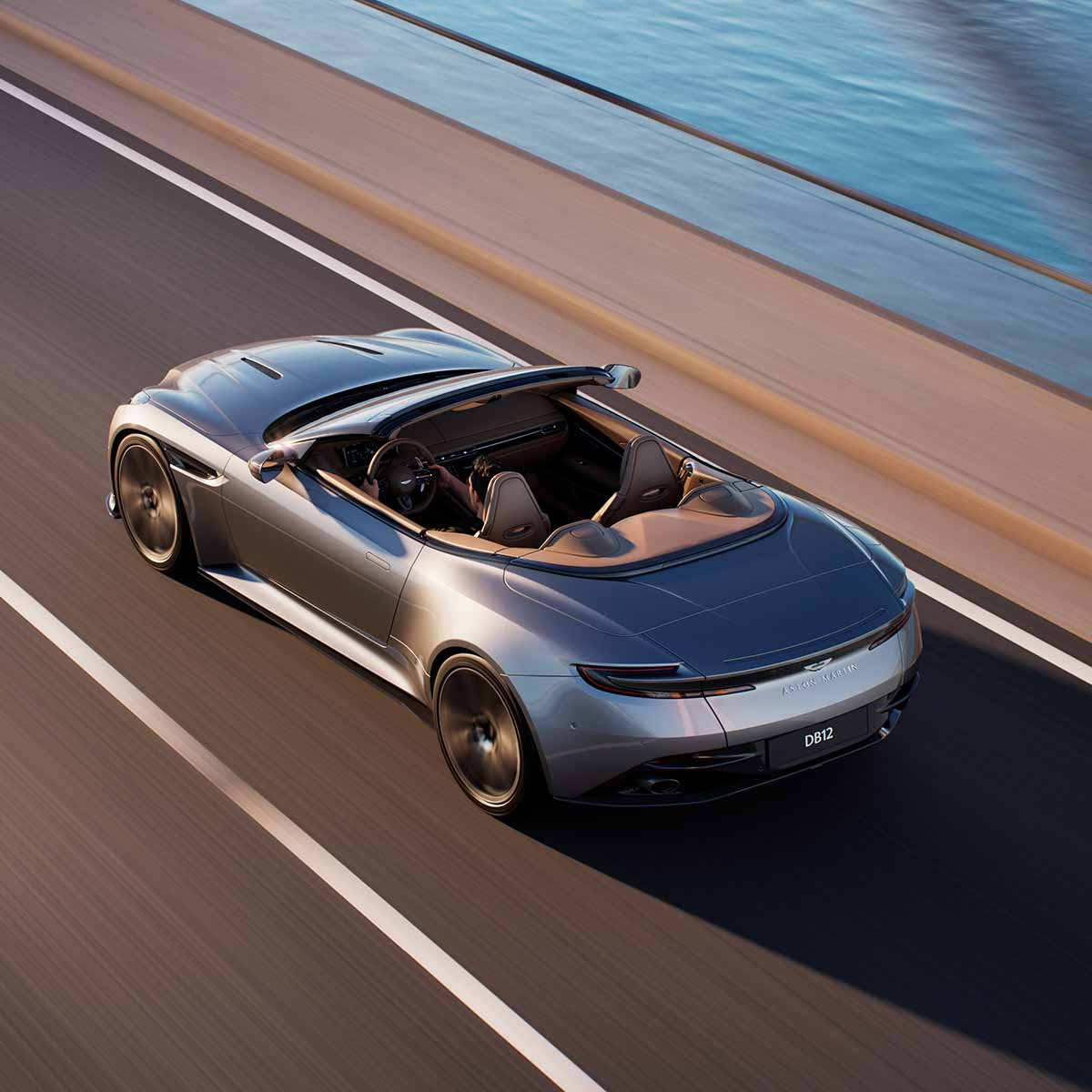 An open-top model made to marvel. DB12 Volante comes topped by the K-fold roof. Completing a refined side profile and filling the cockpit with atmosphere in a class-leading 14 seconds with retractable ease. And able to close while cruising at up to 35mph. Wrapped, folded and stitched to stack at a class-leading 260mm. Sealing your model with a sculpted rear profile and reinforcing the roof canopy with acoustic enhancements. Incorporating eight layers of insulation materials for improved interior cabin comfort. On or off, always a tour to remember.