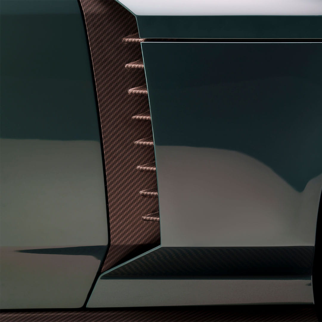 The sculpted front fender adorned with carbon fibre veins not only enhance the car's width and dominance but also facilitate the release of air pressure within the wheel arch, optimising aerodynamic balance.