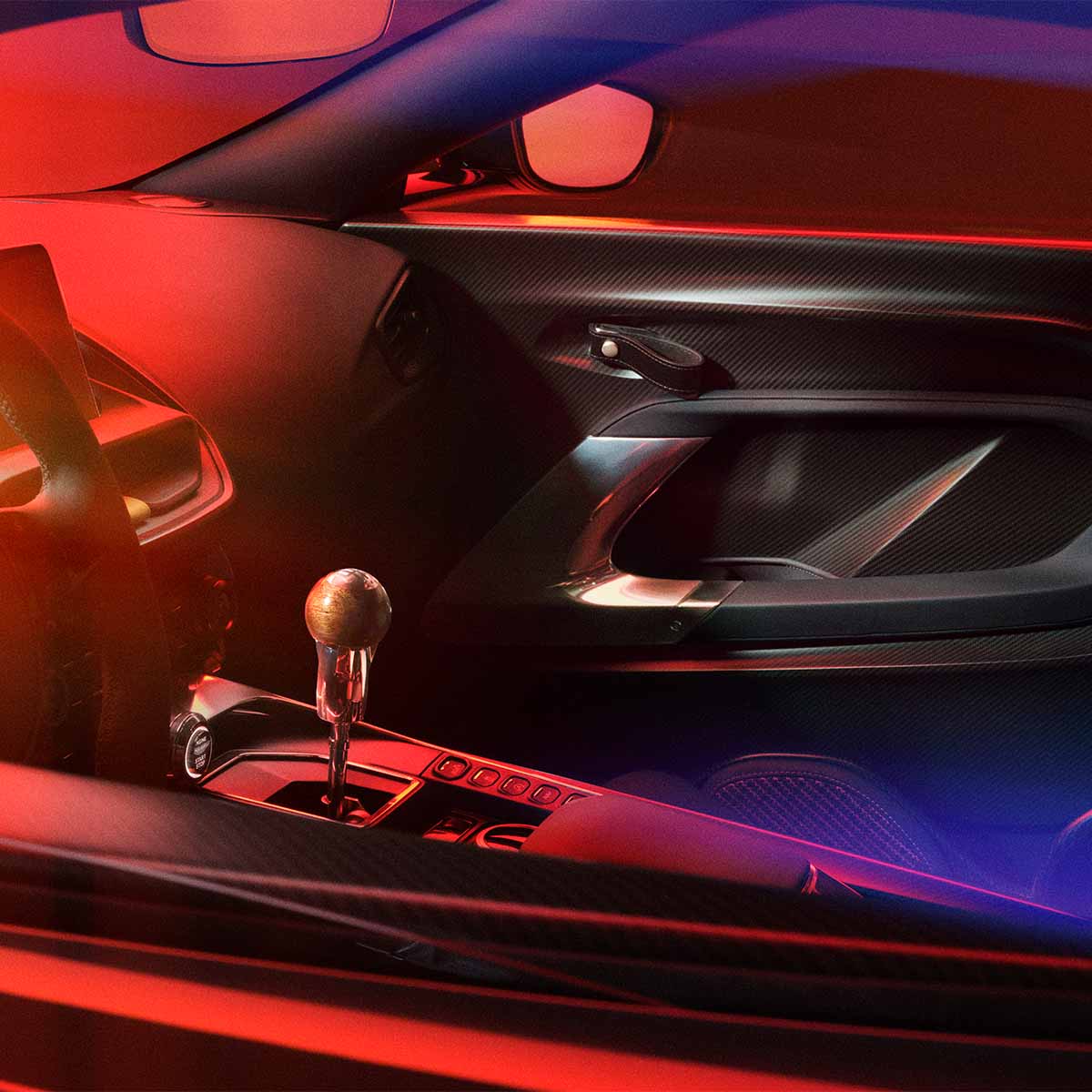 The pairing of the 6-speed manual gearbox with the 5.2-litre V12 twin-turbocharged engine creates an intimately powerful connection between the driver and Valour. Its exposed gear shift mechanism offers a captivating glimpse into its very essence, drawing the driver into the soul of the car from the comfort of the cabin.
