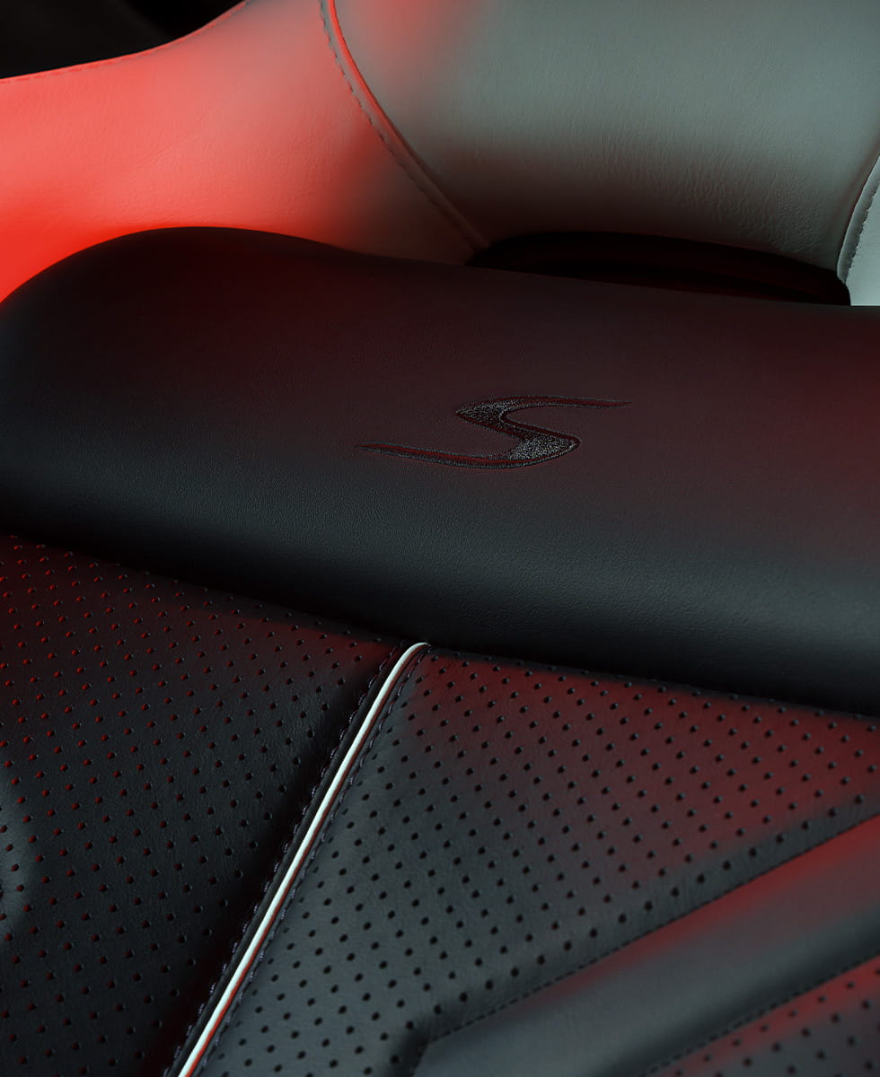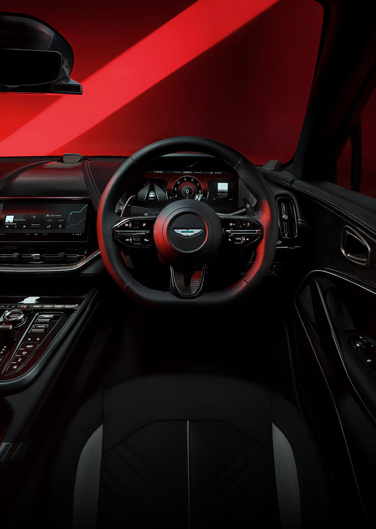 Aston Martin has once again drawn inspiration from the portfolio of Sports and Supercars with the all-new use of Alcantara®, which is synonymous with true sporting prowess and now appointed across many new panels. This lightweight material is embellished with other innovative new materials and precision craft techniques. Performance Herringbone perforation stitching. Sculpted leather headrests with sub-millimetre precision. Signature S embroidery branding to both front seats. Levels of obsessive next-level craftsmanship that take a lifetime to perfect. And a split-second to appreciate.