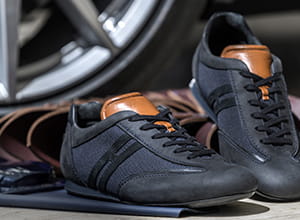The tongue of the sneaker is cut from Aston Martin’s classic kestrel tan leather with pinched seam detailing and feature the iconic Aston Martin wings. Each ‘Aston Martin x Hogan’ sneaker is crafted to the same high standards that are expected by customers of the luxury British marque’s sports cars and those of the Italian master of casual-luxury shoes.