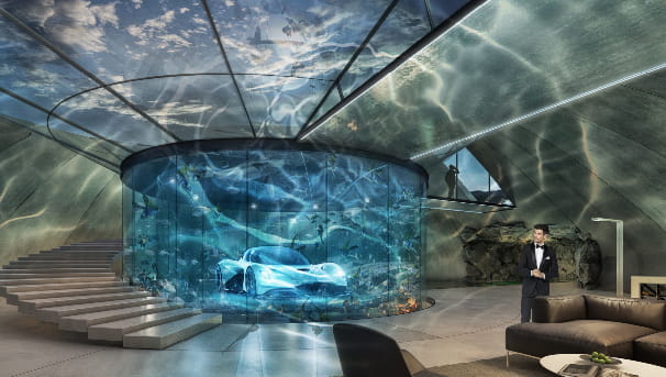 Entire luxury homes or retreats can be created where the car takes centre stage. As an example, Obermoser arch-omo architecture has produced a stunning architectural design concept for an automotive lair that could house works of art including the Aston Martin Valhalla and the iconic Aston Martin DB5, in a subterranean circular space. The chosen car sits at the centre of this extravagant design that focuses attention on the car, whilst providing entertainment and leisure areas, along with living space for guests.
